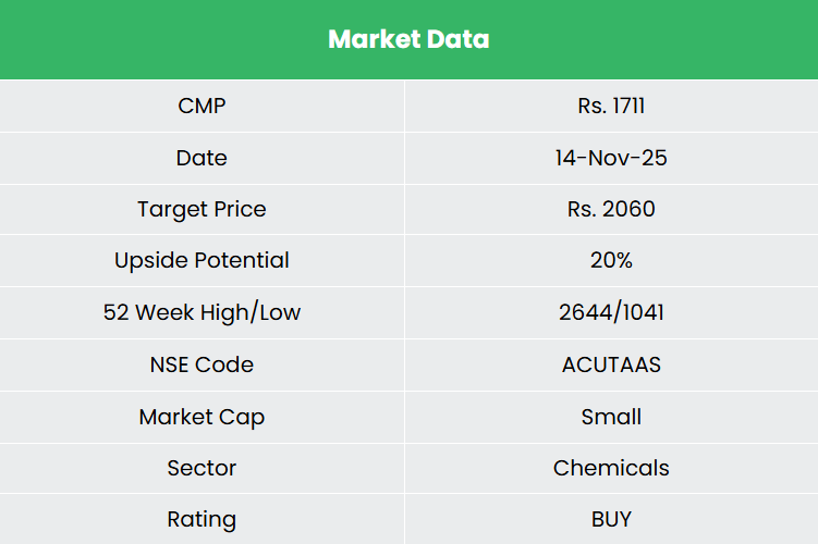With the management maintaining its guidance on revenue growth and margin improvement, coupled with the timely rollout of expansion projects, we believe Acutaas Chemicals Ltd. offers a compelling investment opportunity. We recommend a BUY rating in the stock with the target price (TP) of Rs.2,060, 44x FY27E EPS. We also encourage maintaining a stop-loss at 20% from the entry price to manage potential downside risk effectively.