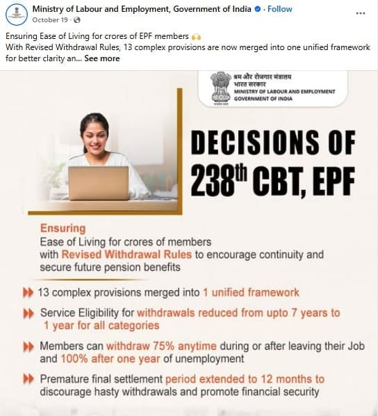 - In case of job loss or unemployment, members can now withdraw 75% of the PF balance (including employer share) immediately, with the remaining 25% allowed after 12 months of continuous unemployment if they choose not to remain members.